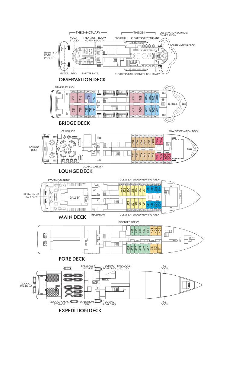 A full suite of expedition tools – including Zodiacs, kayaks and specialised equipment for exploring uncharted waters – supports deep engagement with the polar environment. On board, guests enjoy inviting public spaces such as an observation lounge, library, main lounge with 24 hour beverage station, and an expedition base with lockers for gear. Dining includes Restaurant 270° with wraparound views, along with two additional venues providing flexible, sustainable cuisine with unassigned seating.